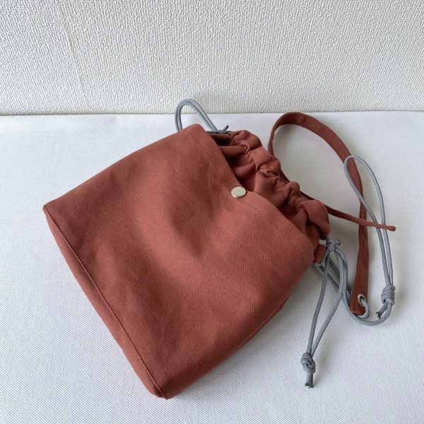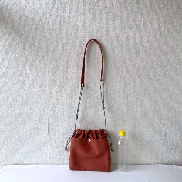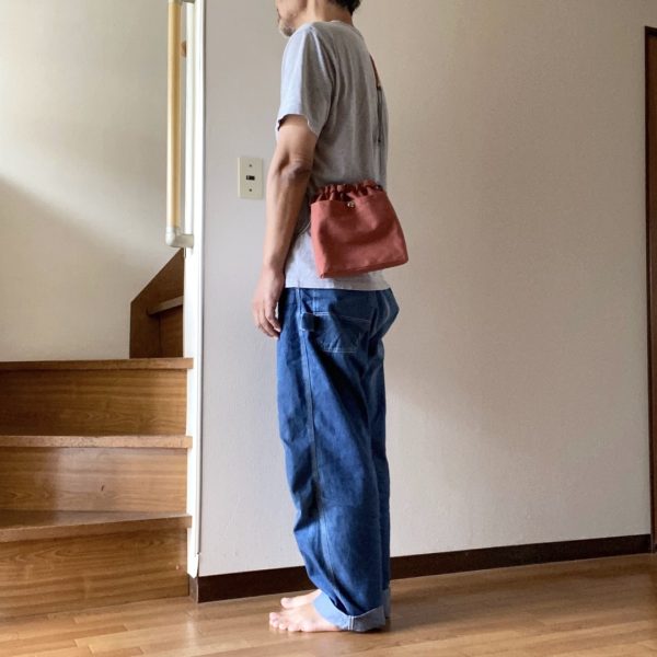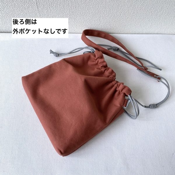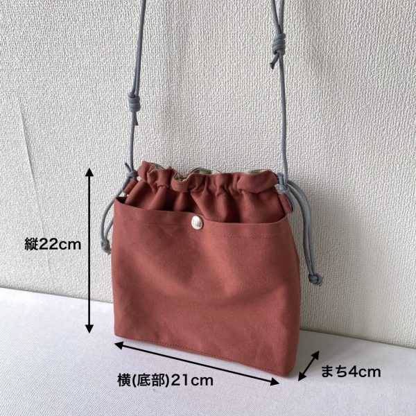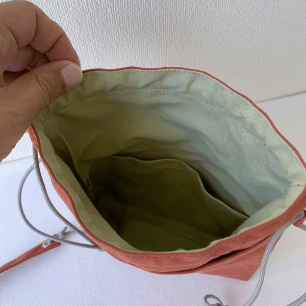 財布やスマホなど身の回りのものが収まるようにイメージしました。入口が巾着になっているので、ひもをキュと閉めれば安全ですね。
