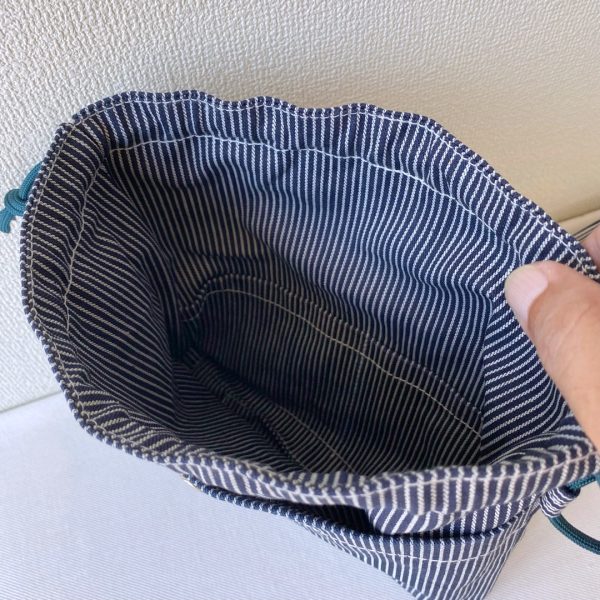 巾着部分は裏地もヒッコリーデニム生地を使いました。内ポケットは2個付いています。