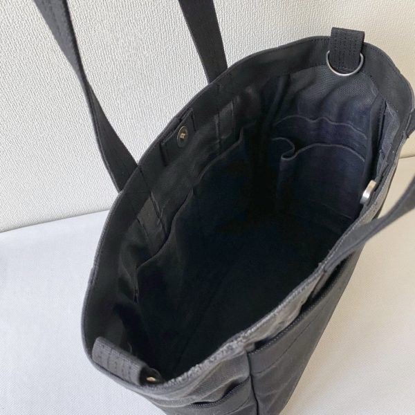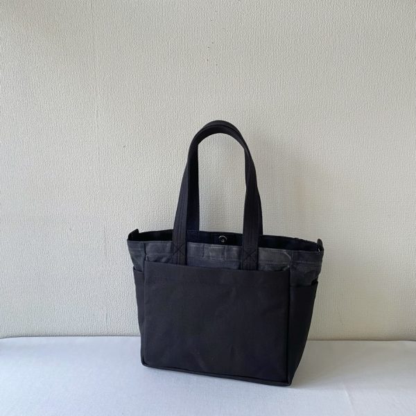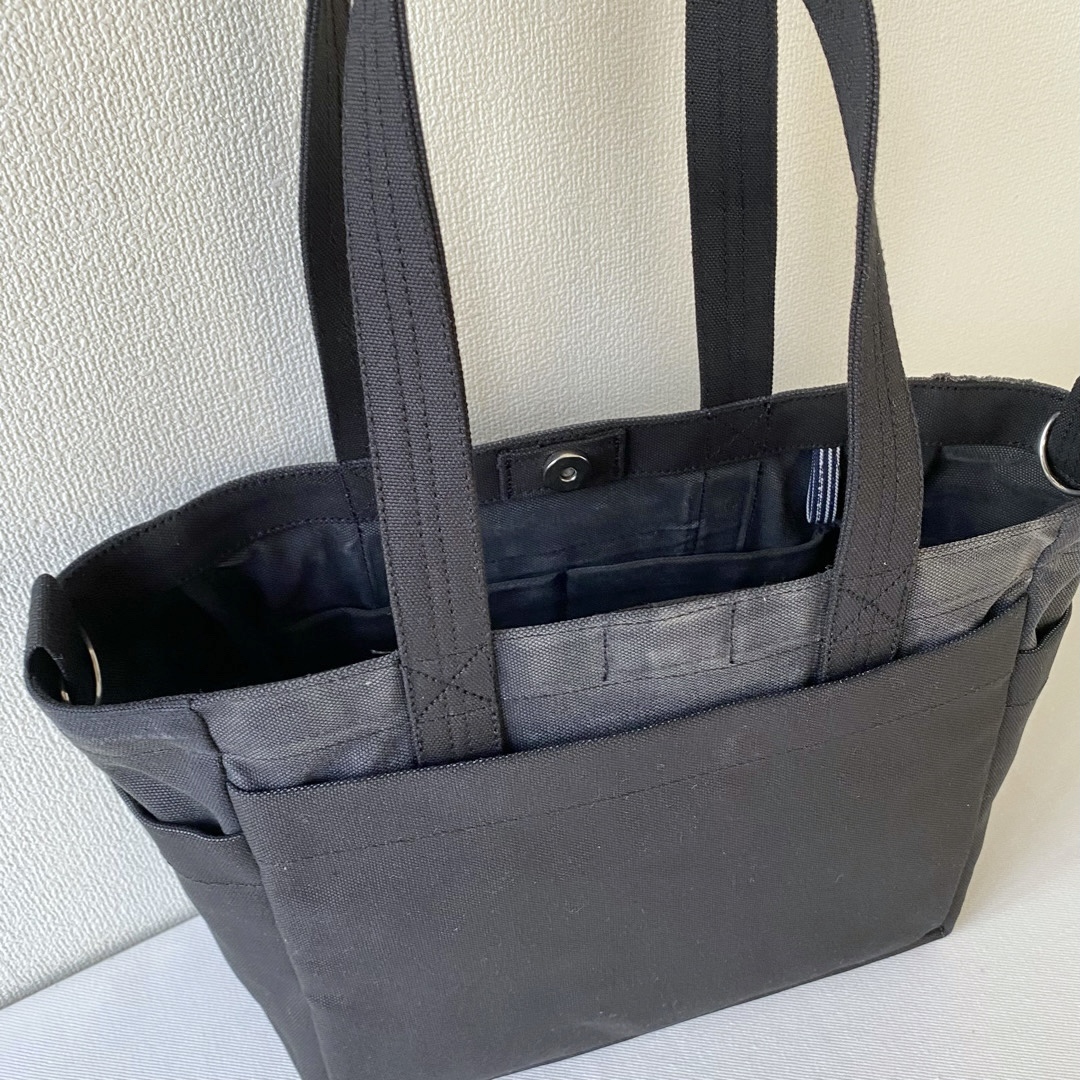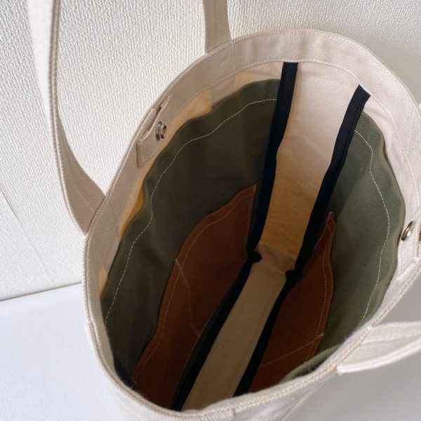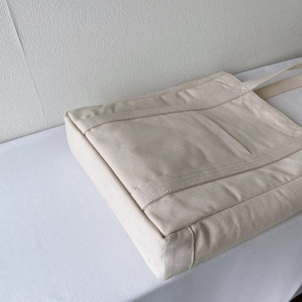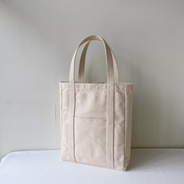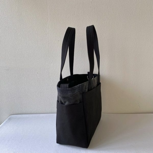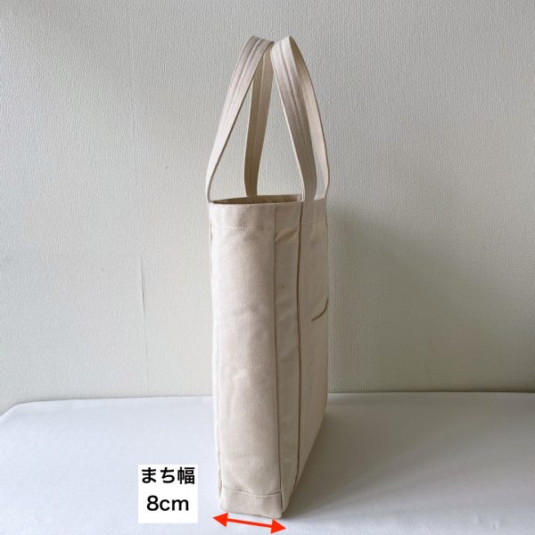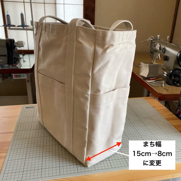 サイズオーダーで作らせていただいた「ポケットトート」のまち幅15cm → 8cm に変更しました。両サイドのポケットもまち幅が小さくなると使いにくくなるので外しました。