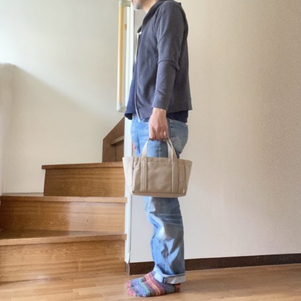 財布と身の回りの小物が入る、ちょっと近くにお出かけするときに邪魔にならない大きさをイメージしました。ミニバッグです。